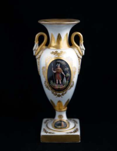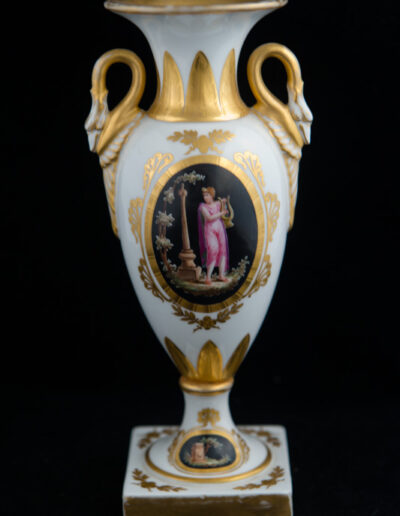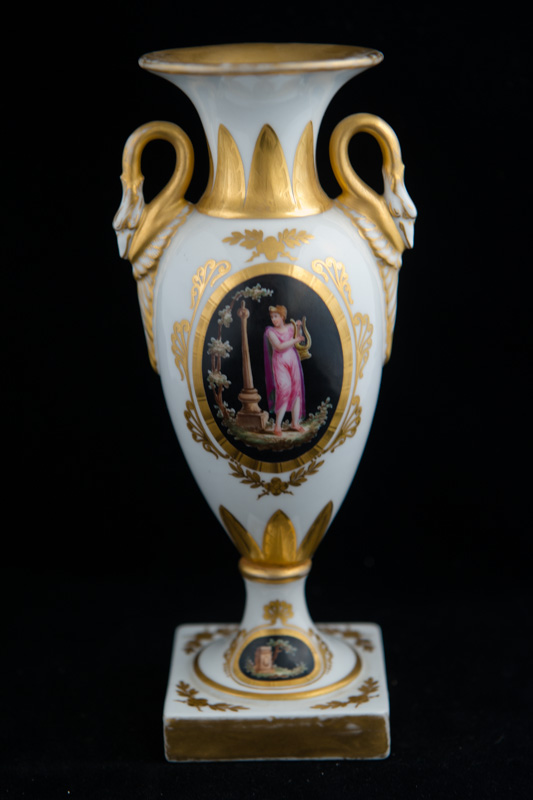Late 19th/20th century, spurious iron-red M N le Sevres mark Of baluster form flanked by swan handles, painted with oval medallions of classical figures, the neck and lower-body gilt with stiff-leaf tips 8 ½ in. (21.6 cm) high LITERATURE Cleo M. and G. Ryland Scott Jr., Antique Porcelain Digest, Newport, England, 1961, p. 195, plate 132, fig 443. NOTES BY CLEO M. AND G. RYLAND SCOTT, JR in the late 1950’s PAIR OF SEVRES URNS. 1804. These are a part of the Friedburg collection and they are exceptionally fine quality. They are of the typical empire shape. The mark was used only in the year 1804. It is hard paste which by this time had entirely replaced the earlier pate tendre. It will be remembered that Napoleon Bonaparte was crowned Emperor in I804. Whi1e the Sevre factory had seen some bad times during the revolution by 1800 under the wise directorship of Brouguiart the factory began to prosper again. Only hard paste (pate dure) was made from this time on and Napoleon put the government back of the project.