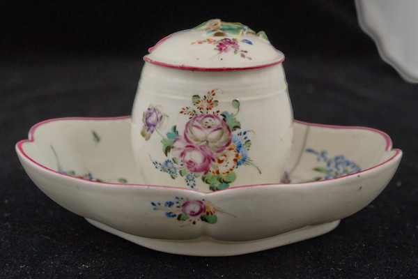 The porcelain 18th century, the decoration of later date Painted with panels of flowers within gilt rocaille surrounds (the stand cracked at one end and with a stapled repair) 4 ½ in. (11.4 cm) high 10 ½ in. (26.7 cm) long LITERATURE Cleo M. and G. Ryland Scott Jr., Antique Porcelain Digest, Newport, England, 1961, p. 195, plate 131, fig. 437. EXIBITION On display in the “George Ryland Scott Collection” at The Memphis Brooks Museum of Art between June 1955 and May 1960
