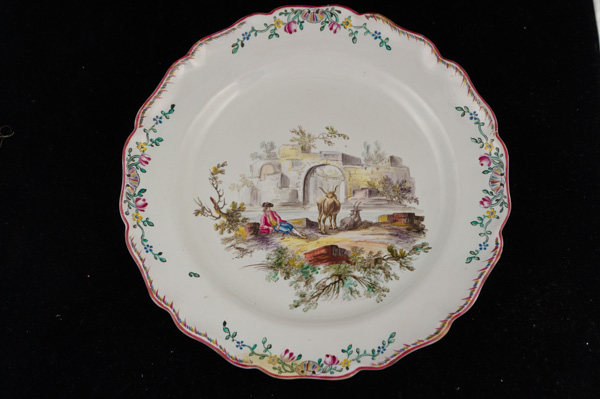 Circa 1770, puce VP mark Painted with a farmer lounging before ruins, two cattle in attendance 9-1/2 in. diameter EXIBITION On display in the Scott-Allen Collection at The High Museum of Art, Atlanta, Georgia from 1976 until 1996 NOTES BY CLEO M. AND G. RYLAND SCOTT, JR IN THE LATE 1950’S MARSEILLE PLATE FAIENCE CR. 1750 While we do not as a rule collect Faience as it does not go well with porcelain, this is an exception and the plate both from the standpoint of glaze and the painting is outstanding. We purchased it in Paris in 1950 from Vandermisch, who specializes in Faience as well as French porcelain.