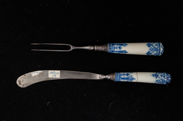 Late 17th century, possibly Rouen or Saint Cloud Decorated with a lambrequin design in underglaze blue (crack around knife handle) Length: 2-7/8 inches LITERATURE Cleo M. and G. Ryland Scott Jr., Antique Porcelain Digest, Newport, England, 1961, pp. 158-159, fig. 43. EXIBITION On display in the Scott-Allen Collection at The High Museum of Art, Atlanta, Georgia from 1976 until 1996